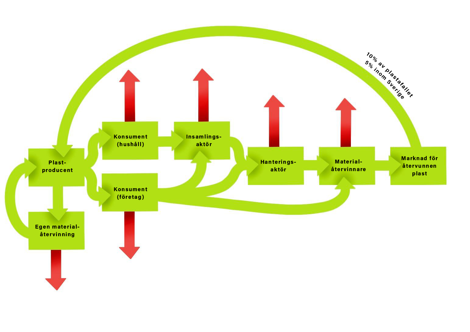I bilderna nedan presenteras det nuvarande plastavfallsflödet i GGVV-regionen och genom att ta hänsyn till föregående aspekter och faktorer kan flödet förändras mot ett mer cirkulärt flöde som tar vara på plastavfallet och minskar spillet genom försörjningskedjan.