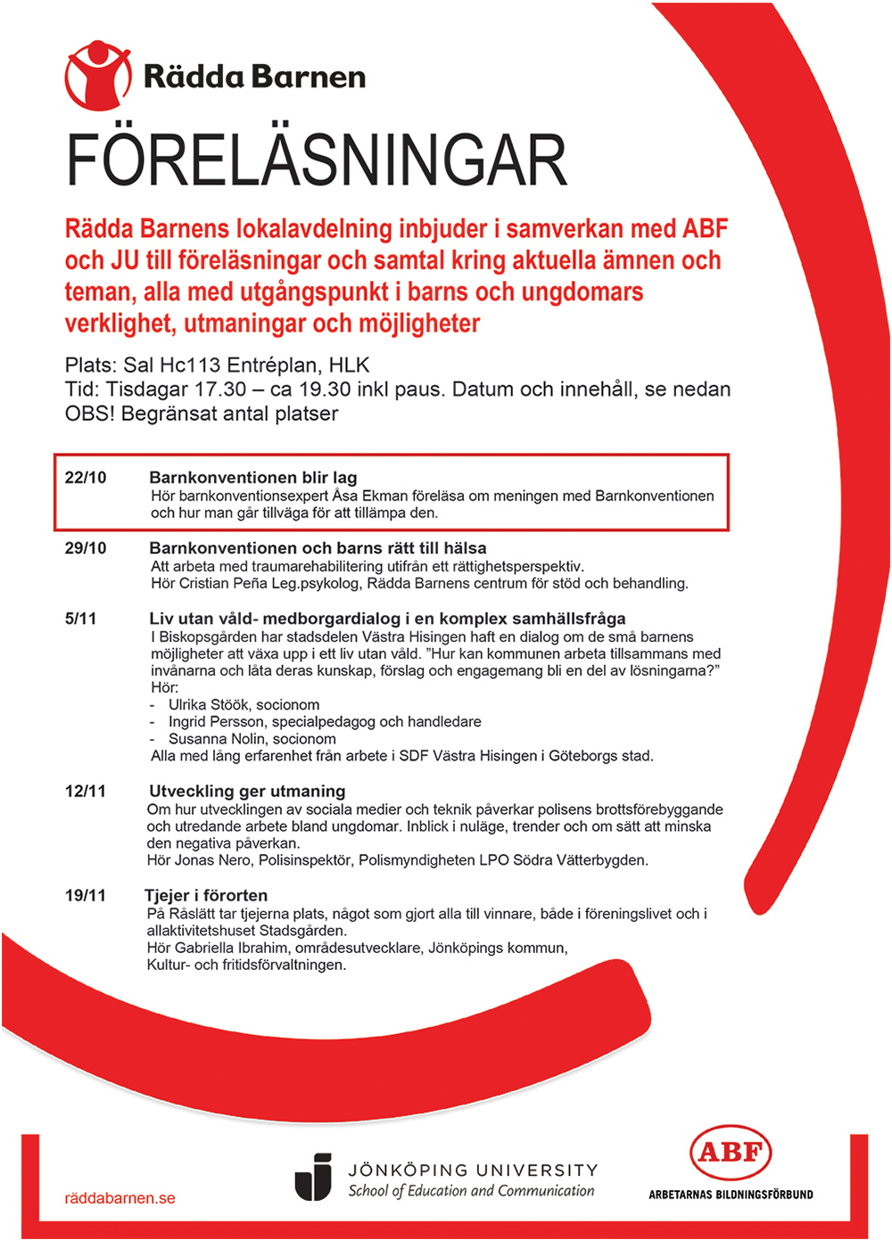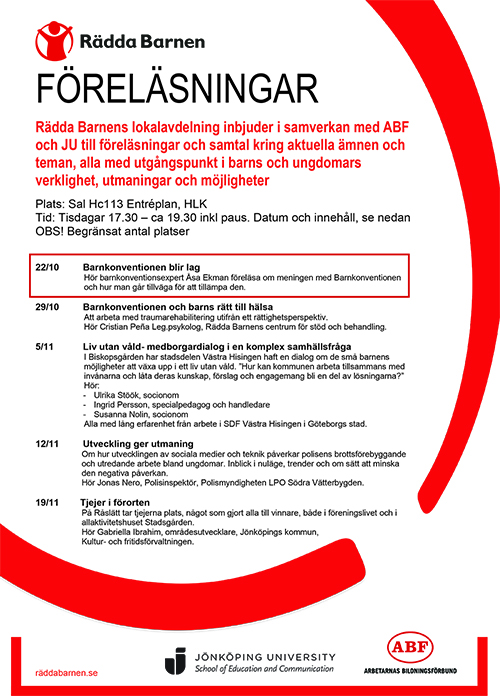 Tisdagen den 22 oktober är första föreläsningen i en serie på fem föreläsningar. Det är Rädda Barnen i samverkan med ABF och Jönköping University som står bakom föreläsningarna, alla med utgångspunkt i barns och ungdomars verklighet, utmaningar och möjligheter.