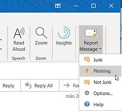 Man ska alltid vara uppmärksam på avsändare till mejl som innehåller länkar eller bilagor, även om namnet ser ut att vara någon du känner. Visningsnamnet i ett mejl är lätt att fejka. Klicka aldrig på länkar eller bilagor om du är osäker på avsändaren. Om du får falska mejl, använd rapporteringsfunktionen i Outlook. Du hittar den i menybandet i det mottagna mejlet.