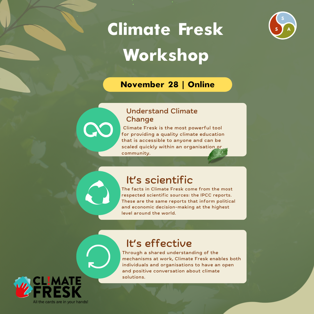 Vill du vara med och tackla klimatförändringarna men har inte tid att bli klimatforskare? På bara 3 timmar lär Climate Fresk-workshopen dig den grundläggande vetenskapen bakom klimatförändringarna och ger dig möjlighet att göra något åt det. Missa inte workshopen den 28 november anordnad av Students for Sustainable Action (SSA).