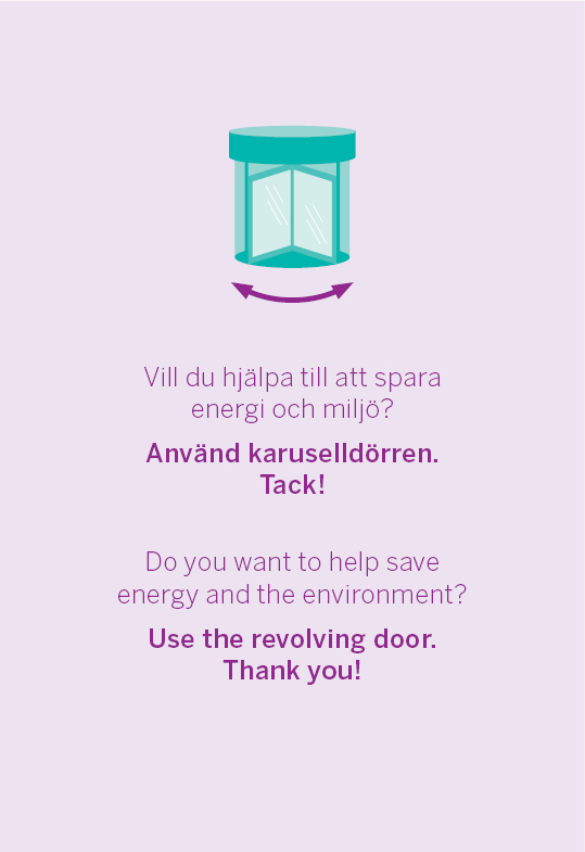 Vid nästan varje entré på campus finns det karuselldörrar och en sidodörr en bit längre bort. Genom att använda karuselldörren hjälper du till att spara på energi eftersom karusellerna är designade att vara luftpassager som bibehåller värmen inomhus under vintern. Tänk på att alltid använda karuselldörrarna när du går in eller ut ur byggnader på campus.