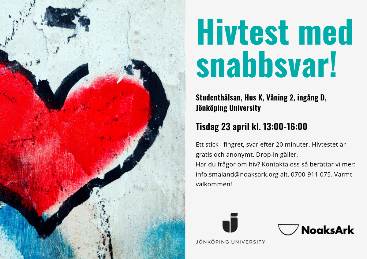 Den 23 april kl. 13-16 kommer Noaks Ark att erbjuda JU:s studenter att ta snabbsvarstest för HIV.